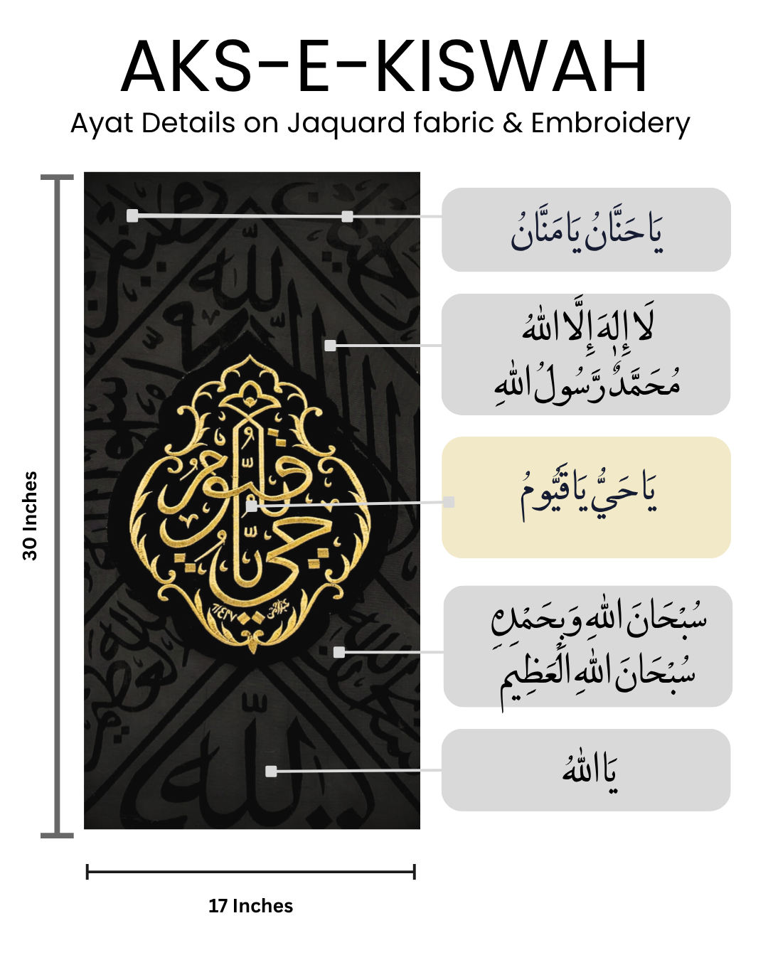 A beautifully crafted Aks-e-Kiswah piece featuring four ayat woven in Jacquard design — inspired by the original Kiswah of the Holy Kaaba.